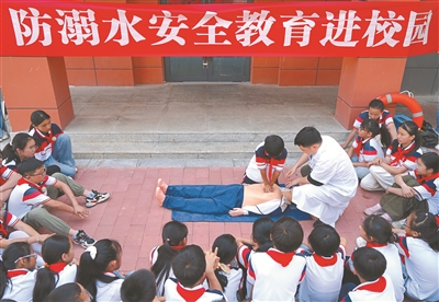 入夏以來(lái),安徽省懷寧縣聚焦巡查、宣傳、家校聯(lián)動(dòng),組織開(kāi)展防溺水安全教育進(jìn)校園活動(dòng),全方位織密防溺水“安全網(wǎng)”,為青少年生命安全保駕護(hù)航。圖為5月19日,在懷寧縣月山鎮(zhèn)中心學(xué)校,鎮(zhèn)衛(wèi)生院醫(yī)護(hù)人員和志愿者現(xiàn)場(chǎng)教授學(xué)生如何開(kāi)展自救和互救。檀志揚(yáng) 朱敏麗 攝