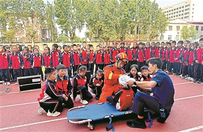 5月12日,山東省棗莊市山亭區(qū)消防救援大隊(duì)走進(jìn)轄區(qū)中小學(xué)校,開(kāi)展“人人講安全、個(gè)個(gè)會(huì)應(yīng)急——排查身邊災(zāi)害隱患”主題防災(zāi)減災(zāi)知識(shí)進(jìn)校園活動(dòng),向?qū)W生們傳授海姆立克急救法、救護(hù)包扎等應(yīng)急救護(hù)知識(shí),提高學(xué)生們的應(yīng)急救護(hù)意識(shí)和能力。圖為消防救援人員在棗莊市薛城區(qū)礦建路小學(xué)向?qū)W生們傳授應(yīng)急救護(hù)知識(shí)。季龍 攝