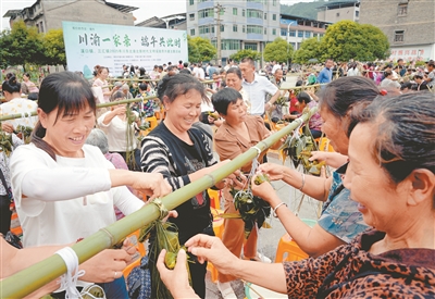5月28日,四川省華鎣市溪口鎮(zhèn)與相鄰的重慶市合川區(qū)三匯鎮(zhèn)十多個村(社區(qū))的1000余名群眾齊聚一堂,開展包粽子比賽,在熱鬧歡樂中迎接端午。圖為華鎣市溪口鎮(zhèn)舉辦的川渝邊界村村民包粽子比賽現(xiàn)場。