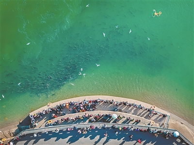 四川宜賓三江口魚游鳥飛,引來市民圍觀。