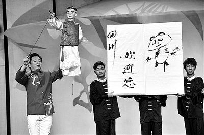如何創(chuàng)新?在胡海的帶領(lǐng)下,資中縣木偶劇團(tuán)將川劇中的變臉、吐火絕技與木偶戲結(jié)合,同時(shí),書法、長(zhǎng)綢舞等元素也納入創(chuàng)新范圍,先后研發(fā)、創(chuàng)新出《長(zhǎng)袖舞》《木偶變臉吐火》《木偶書法》等劇目;糅合內(nèi)江本土文化,創(chuàng)作了四川曲藝說唱表演《竹琴悠悠唱內(nèi)江》、四川曲藝盤子《資中新唱》、大型木偶劇《張大千之匪巢磨難》。