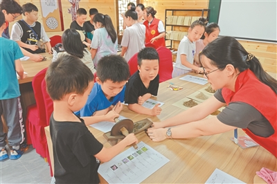 圖② 暑托班志愿者教小朋友研磨中藥材。(圖片由威遠(yuǎn)縣文明辦提供)