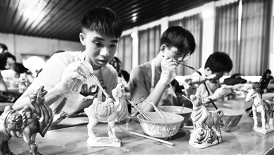 7月19日,河南省洛陽市孟津區(qū)“三彩小鎮(zhèn)”朝陽鎮(zhèn)南石山村唐三彩文化園迎來大批研學(xué)學(xué)生,大家欣賞唐三彩藝術(shù)品及復(fù)原的古代唐三彩窯爐遺址,親身體驗唐三彩制作工藝,感受國家級非遺唐三彩燒制技藝的魅力。圖為學(xué)生們在體驗唐三彩素胎施釉技藝。