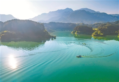 近年來,安徽省安慶市岳西縣大力推進(jìn)湖泊生態(tài)保護(hù)工作,持續(xù)開展巡湖行動(dòng),加強(qiáng)對(duì)湖泊水質(zhì)、生物多樣性等方面的監(jiān)測(cè)與保護(hù),讓湖水愈發(fā)清澈。圖為8月19日,在該縣天堂湖,工作人員駕駛船只在湖面上進(jìn)行日常巡護(hù)。