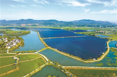 近年來,安徽省蕪湖市統(tǒng)籌推進(jìn)太陽(yáng)能發(fā)電、風(fēng)電等新能源的開發(fā)利用,加強(qiáng)配套電網(wǎng)建設(shè),提供優(yōu)質(zhì)服務(wù),推動(dòng)新能源產(chǎn)業(yè)高質(zhì)量發(fā)展,助力節(jié)能減排。圖為8月20日,平鋪鎮(zhèn)岱湖灘漁光互補(bǔ)光伏電站與田園、水系等相互映襯,構(gòu)成一幅綠色生態(tài)畫卷。肖本祥 攝