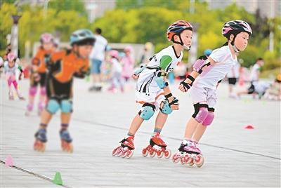 暑假期間,安徽省亳州市許多青少年選擇輪滑等特色體育項目,在訓練中磨練意志、增強體能,健康快樂度暑假。 圖為近日,在亳州市高新區(qū)體育館門前廣場,一些青少年在教練的指導下練習輪滑。 劉勤利 攝