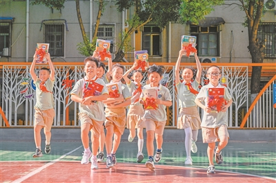 近日,安徽省合肥市各中小學(xué)迎來秋季開學(xué),學(xué)生們安全有序到校報到,領(lǐng)取新書,喜迎新學(xué)期的到來。圖為8月28日合肥市廬陽區(qū)雙崗街道虹橋小學(xué)的學(xué)生們領(lǐng)到新書。趙明 攝