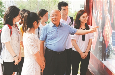 高德敏(右三)在向游客介紹戰(zhàn)旗村相關(guān)情況。