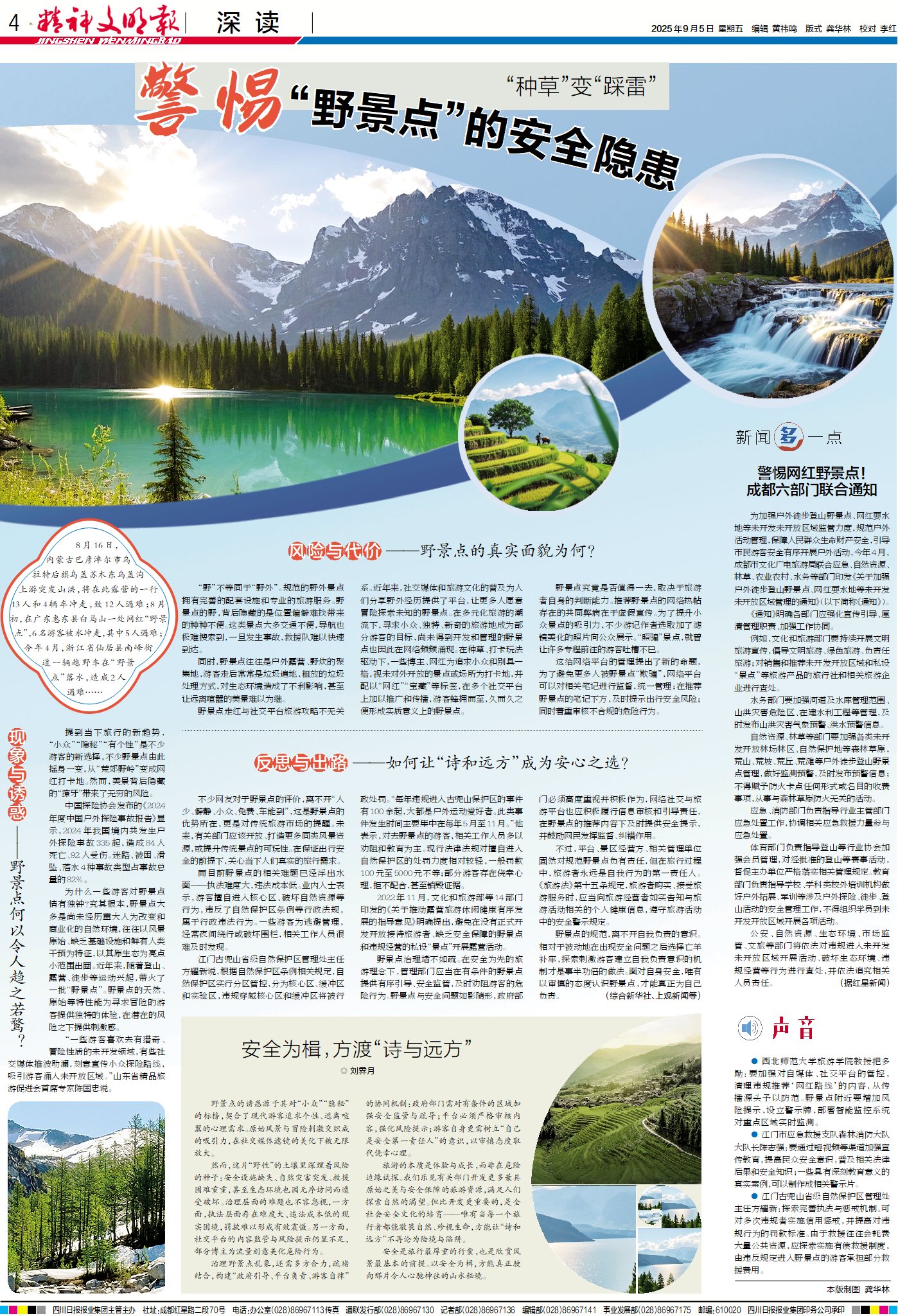 ● 西北師范大學(xué)旅游學(xué)院教授把多勛:要加強(qiáng)對(duì)自媒體、社交平臺(tái)的管控,清理違規(guī)推薦‘網(wǎng)紅路線’的內(nèi)容,從傳播源頭予以防范。野景點(diǎn)附近要增加風(fēng)險(xiǎn)提示,設(shè)立警示牌,部署智能監(jiān)控系統(tǒng)對(duì)重點(diǎn)區(qū)域?qū)崟r(shí)監(jiān)測(cè)。