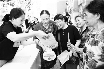 9月9日,江蘇省連云港市連云區(qū)社會(huì)保障中心聯(lián)合墟溝街道便民服務(wù)中心,在東園社區(qū)開展“社保服務(wù)進(jìn)社區(qū)”主題宣講活動(dòng)。工作人員圍繞養(yǎng)老保險(xiǎn)繳費(fèi)檔次、靈活就業(yè)人員參保、資格認(rèn)證、醫(yī)保報(bào)銷等群眾普遍關(guān)心的熱點(diǎn)問題,通過設(shè)立咨詢臺(tái)、發(fā)放宣傳資料、現(xiàn)場(chǎng)答疑等方式,將國(guó)家的社?;菝裾咚偷骄用窦议T口。圖為工作人員給居民講解養(yǎng)老保險(xiǎn)相關(guān)政策。朱華南 顧笑 攝