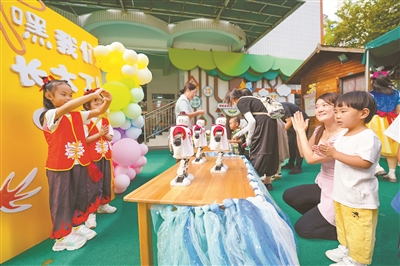 9月11日,福建省福州市鼓樓區(qū)的福建省直玉佩僑育幼兒園內(nèi),一場以“初遇成長,托班萌娃入園”為主題的迎新會熱鬧開啟,機器人舞蹈、平衡木行走等游戲讓新入園的托育班孩子感受到快樂溫馨的成長氛圍。今年以來,福州市積極推動公辦幼兒園、普惠園、社會力量共同興辦發(fā)展托育教育,通過落實落細健康保健、資金補貼、志愿服務(wù)等多層面扶持政策,全力打造“15分鐘托育圈”。圖為新入園的孩子與機器人互動。謝貴明 攝