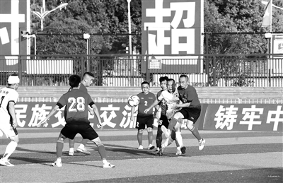 10月11日,在貴州省黔東南苗族侗族自治州榕江縣城北新區(qū)“村超”足球場,榕江縣教職工代表隊球員(白衣)與凱里市教育局代表隊球員在比賽中激烈拼搶。圖為比賽現(xiàn)場。李長華 攝