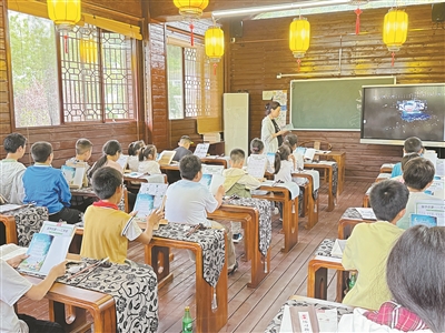 拾級(jí)而上,就來(lái)到二樓的“清蓮學(xué)堂”。輕輕推開(kāi)清蓮學(xué)堂的木門(mén),25歲的西河鎮(zhèn)公共事業(yè)服務(wù)中心工作人員阮書(shū)旖正在講臺(tái)上捧書(shū)踱步,掌心輕拂泛黃書(shū)頁(yè),悠然吟誦:“予獨(dú)愛(ài)蓮之出淤泥而不染,濯清漣而不妖……”一句誦罷,臺(tái)下20余名孩童的誦讀聲便齊齊響起。