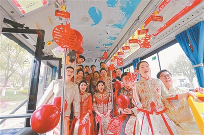 象山縣新人乘坐“花田喜事”公交婚車(chē)舉辦集體婚禮。(寧波市文明辦供圖)
