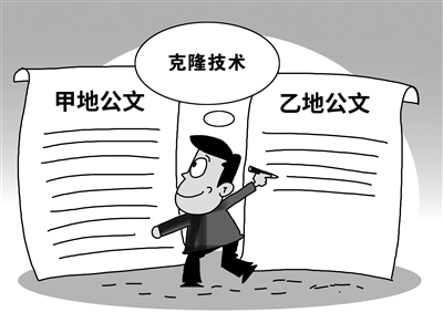 近年來,公文抄襲事件時(shí)有所見,前不久媒體就曝光了兩起:山西某地的一篇領(lǐng)導(dǎo)調(diào)研稿,竟和當(dāng)?shù)啬硢挝坏牧硪黄I(lǐng)導(dǎo)調(diào)研稿高度雷同;廣西某縣的森林防火規(guī)劃中,關(guān)于水文數(shù)據(jù)的描述竟與500公里外湖南某縣的文本幾乎一模一樣,甚至照搬了外地的鄉(xiāng)鎮(zhèn)名稱……