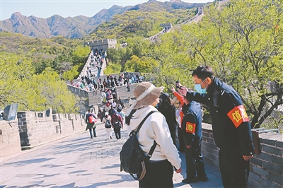 八達(dá)嶺長(zhǎng)城志愿服務(wù)崗常態(tài)化開展問路指引、文明勸導(dǎo)等服務(wù)。申冰堂 攝