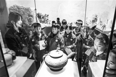 11月28日,安徽省蕪湖市繁昌區(qū)新港鎮(zhèn)中心小學(xué)組織學(xué)生到繁昌博物館研學(xué)。活動中,學(xué)生們認真聆聽講解員講述,感受中華文明厚重,增強民族自豪感與歸屬感。圖為新港鎮(zhèn)中心小學(xué)在參觀文物。肖本祥 攝