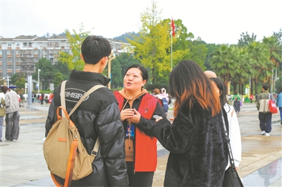 峨山街道志愿者向游客提供音樂(lè)節(jié)活動(dòng)咨詢服務(wù)。