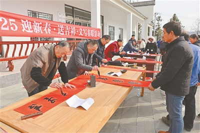 文藝志愿者為村民義寫(xiě)春聯(lián)。