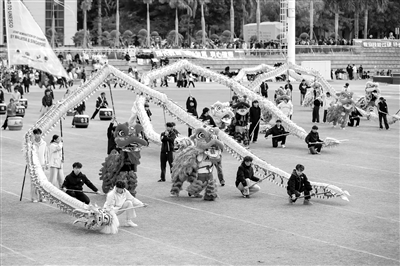 近年來(lái),福建省晉江市大力弘揚(yáng)中華優(yōu)秀傳統(tǒng)文化,將傳統(tǒng)非遺體育項(xiàng)目列為校本課程,通過(guò)基礎(chǔ)專業(yè)技藝訓(xùn)練、組織巡演和非遺進(jìn)鄉(xiāng)村等方式,讓大學(xué)生在體育活動(dòng)中鍛煉身體,共享體育樂(lè)趣。圖為12月14日,泉州輕工職業(yè)學(xué)院的大學(xué)生在進(jìn)行非遺舞龍展示。