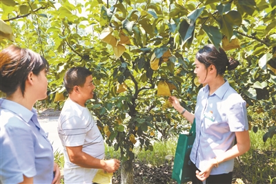 農(nóng)行工作人員了解雪梨種植戶經(jīng)營情況。