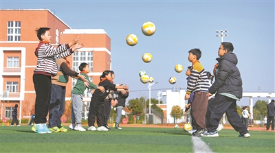 近年來,江蘇省海安市李堡鎮(zhèn)中心小學(xué)持續(xù)打造豐富多彩的陽光體育大課間,讓學(xué)生在運(yùn)動(dòng)中享受樂趣、增強(qiáng)體質(zhì)、健康成長。圖為近日,學(xué)生在大課間練習(xí)排球。周強(qiáng) 攝