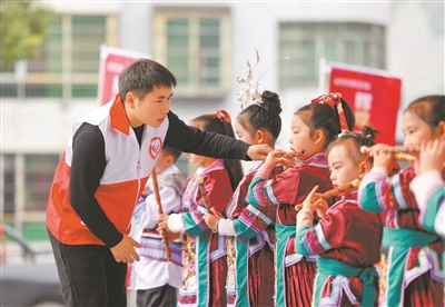 近年來,貴州省銅仁市玉屏侗族自治縣團委聯(lián)合縣文聯(lián),組織竹笛吹奏志愿者,利用周末、節(jié)假日等時間,推出“竹青聲”竹笛公益課堂,免費指導(dǎo)少年兒童學(xué)習(xí)竹笛吹奏,豐富精神文化生活,深受廣大少年兒童及家長贊譽。圖為1月17日,少兒學(xué)員在竹笛公益課堂匯報展演活動上吹奏竹笛。胡攀學(xué) 攝