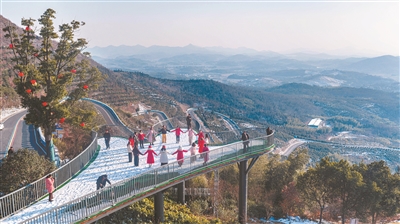 1月22日,雪后,在安徽省合肥市廬江縣“廬南川藏線”礬山鎮(zhèn)“六道拐”路段觀景平臺(tái),游客在積雪上翩翩起舞,樂享冬日賞雪觀景之妙趣。