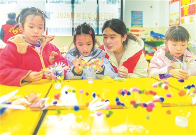 寒假期間,湖南省永州市道縣開展“共青團(tuán)·伙伴計(jì)劃”寒假愛心托管項(xiàng)目,發(fā)動(dòng)返鄉(xiāng)大學(xué)生志愿者參與托管服務(wù),面向網(wǎng)約車司機(jī)、外賣配送員等新就業(yè)群體勞動(dòng)者子女,提供暖“新”看護(hù)服務(wù),通過開設(shè)心理健康課、趣味手工等課程,讓孩子們度過一個(gè)快樂寒假。圖為1月28日,道縣第四小學(xué),志愿者和孩子們一起制作手工作品。蔣克青 攝