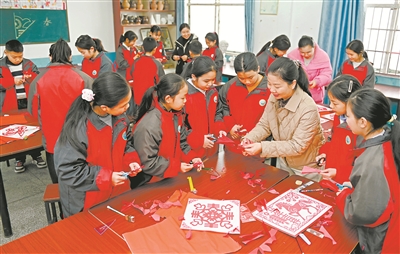 近年來(lái),湖南省邵陽(yáng)市洞口縣將剪紙、書法、古箏等中華優(yōu)秀傳統(tǒng)文化項(xiàng)目引入課后服務(wù)活動(dòng),豐富學(xué)生課后生活。圖為洞口初級(jí)中學(xué)的老師傳授剪紙技法。 滕治中 攝