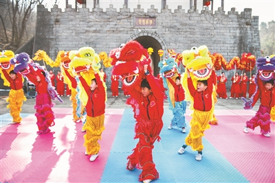 1月24日,安徽省含山縣昭關(guān)鎮(zhèn)伍相祠城墻前熱鬧非凡,當(dāng)?shù)匚湫g(shù)學(xué)校的孩子們帶來(lái)非遺舞獅表演。表演者們動(dòng)作矯健、姿態(tài)靈動(dòng),精彩的表演吸引市民駐足觀看。
