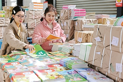 新學(xué)期開(kāi)學(xué)臨近,山東省棗莊市積極做好學(xué)生教材分類(lèi)、配送、發(fā)放等工作,為開(kāi)學(xué)做好準(zhǔn)備。圖為2月25日,在棗莊市新華書(shū)店教材發(fā)行中心,工作人員在清點(diǎn)整理新學(xué)期教材。