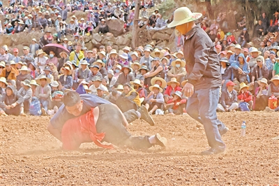近日,有著700余年歷史的云南省彌勒市西三鎮(zhèn)膩黑村熱鬧非凡。這個(gè)被列入第一批中國(guó)傳統(tǒng)村落名錄的彝族村寨舉辦彝族摔跤運(yùn)動(dòng)會(huì),吸引萬(wàn)余名游客和群眾在賞摔跤、品美食、跳月狂歡中體驗(yàn)濃郁的民族風(fēng)情。圖為彝族摔跤運(yùn)動(dòng)會(huì)比賽現(xiàn)場(chǎng)。 趙樹(shù)龍 攝