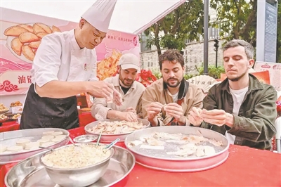 2月12日,外國友人在2026廣州水上花市開市現(xiàn)場學習制作油角。畢志毅 攝