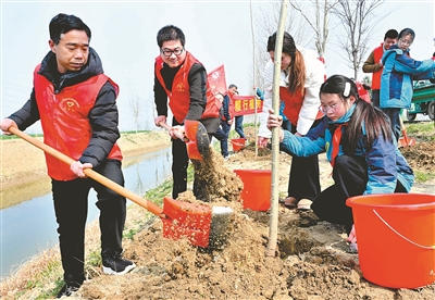 3月9日,安徽省亳州市利辛縣汝集鎮(zhèn)的黨員志愿者和少先隊員在植樹。劉勤利 張廷 攝