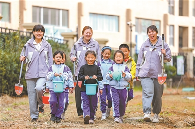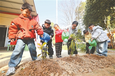 3月11日,在浙江省湖州市吳興區(qū)埭溪鎮(zhèn)中心幼兒園,小朋友和老師一起給剛栽種的樹苗澆水。何偉衛(wèi) 攝