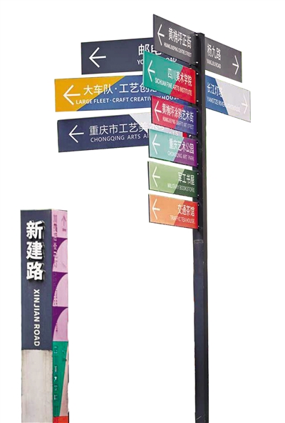 在九龍坡區(qū)黃桷坪街道,筆者被一塊導(dǎo)視牌吸引住了。它的造型、顏色與周?chē)耐盔f墻完美融合,在陽(yáng)光下散發(fā)出“藝術(shù)的氣息”。