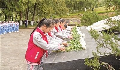 通江李先念紅軍小學(xué)的少先隊(duì)員們?cè)谇迕鲿r(shí)節(jié)來(lái)到川陜革命根據(jù)地紅軍烈士陵園,為革命英雄獻(xiàn)上鮮花。周樹(shù)江 攝