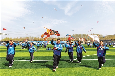 4月8日,山東省淄博市淄川經(jīng)濟(jì)開發(fā)區(qū)實(shí)驗(yàn)學(xué)校立足“健康第一”教育理念,利用大課間開展“箏奇斗妍 放飛夢想”校園風(fēng)箏節(jié)活動。學(xué)生們在老師的指導(dǎo)下放飛風(fēng)箏,感受傳統(tǒng)風(fēng)箏文化,體驗(yàn)春日校園樂趣。翟慎安 張穎 攝