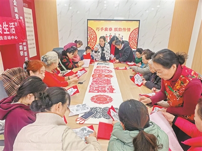 “巧手裁春 紙韻傳情”——群眾在新時代文明實踐站學剪紙迎新春。